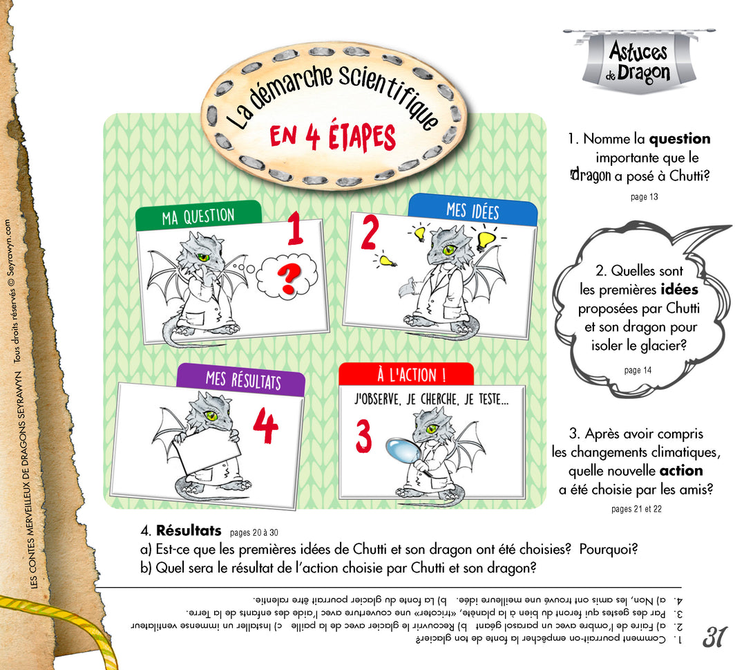 Pour les parents Ce conte ludique permet à nos jeunes de saisir les étapes de la réflexion de la démarche scientifique. Tout en explorant les causes et effets des changements climatiques, ils découvriront aussi de possibles solutions à leur portée d'enfants. Et qui sait, ces stratégies pourront-elles être aussi utiles à nous comme adultes?