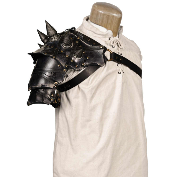 Cette armure a été conçue pour un véritable guerrier barbare. En cuir végétal moulé et plaqué de métal patiné, chaque pièce est soigneusement usée à la main, ce qui donne à son porteur le look de celui qui a vécu son lot de batailles violentes. Entièrement modulaire, il est possible de choisir plusieurs types de brassards, épaulettes et manches pour personnaliser l'ensemble. Du à l'effet de vieillissement à la main, chaque pièce est unique d'une série à l'autre. Les piques sur l'épaulette sont en mousse Calimacil et donc parfaitement sécuritaires. L'Armure du Ravageur, entièrement personnalisable, a tout pour faire de son porteur le plus impressionnant et féroce des barbares!