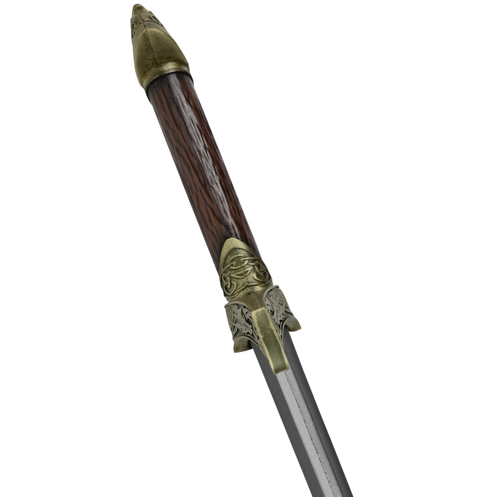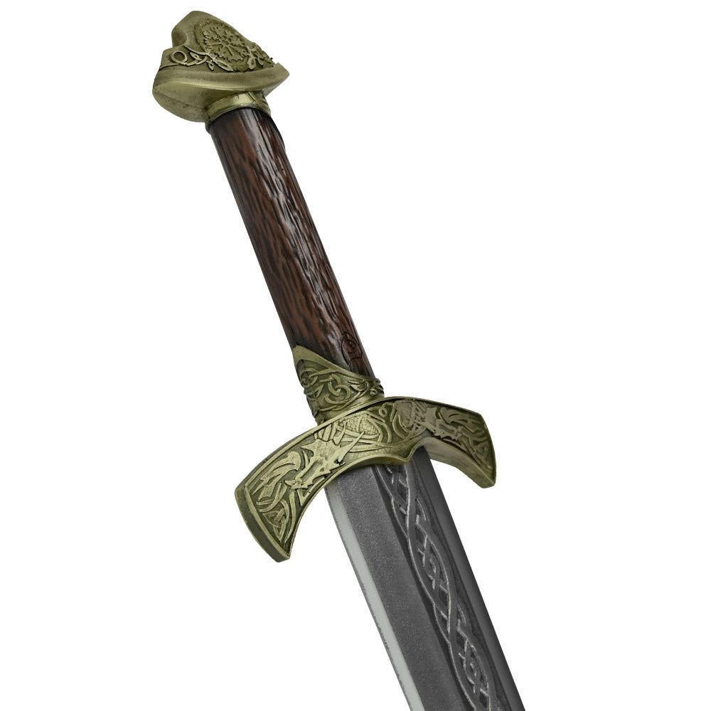 La fabrication de l'épée viking Hersir a de nouveau nécessité l'expérience et l'innovation pour lesquelles Calimacil est connu. Repoussant les limites du possible, l'équipe s'est retrouvée avec une épée de grande qualité. La garde, d'inspiration historique, de cette arme présente des gravures illustrant la noblesse des dragons. Son manche en bois, arborant 2 anneaux métalliques gravés, affine l'ensemble. Sur son pommeau, un vergvisir, une boussole viking indiquera la voie à suivre aux aventuriers. Enfin, sur la lame et ses courbes inspirées par la fantaisie, les nœuds celtiques se fondent dans le motif, donnant à la Hersir une élégance royale.