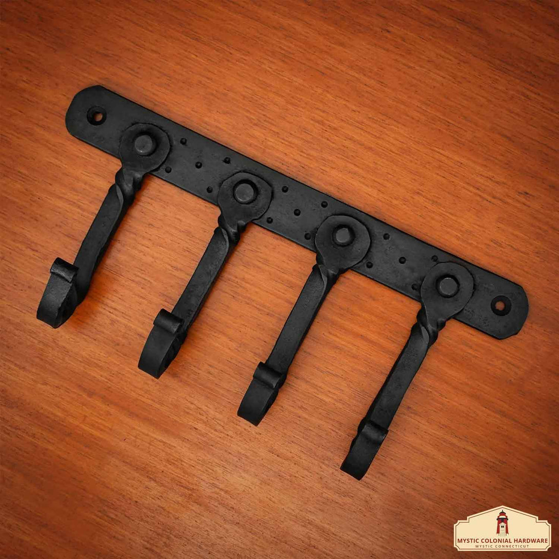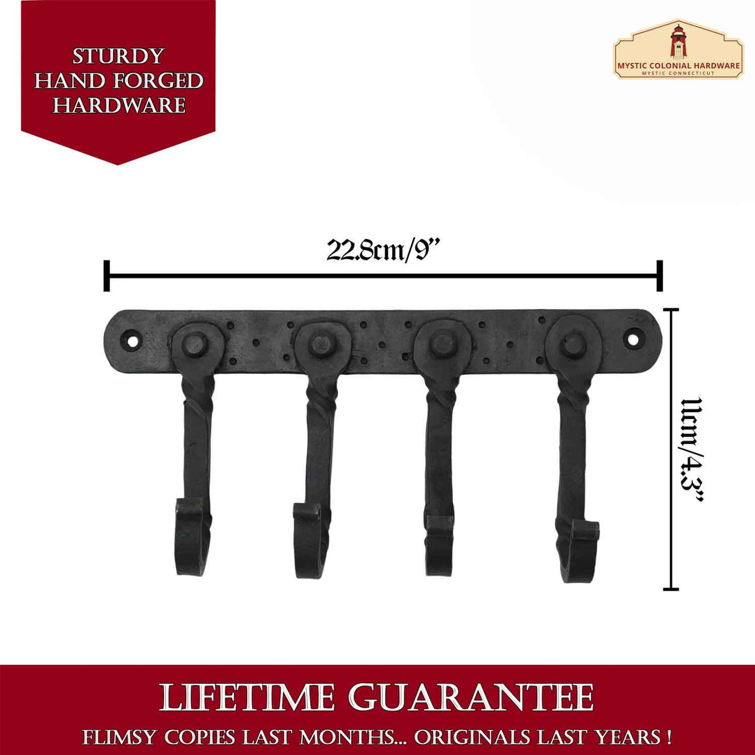Les quatre crochets arrondis sont répartis uniformément sur une base martelée à la main, offrant un espace généreux pour suspendre manteaux, clés, chapeaux, outils ou ustensiles de cuisine. Mesurant 22,8 cm x 11 cm (9" x 4,3"), il s'intègre parfaitement dans les entrées, les espaces de travail ou les intérieurs à thème. Fini avec un revêtement noirci à l'huile classique, chaque pièce porte les marques de sa forge, lui conférant une authenticité incomparable et une touche de caractère historique.