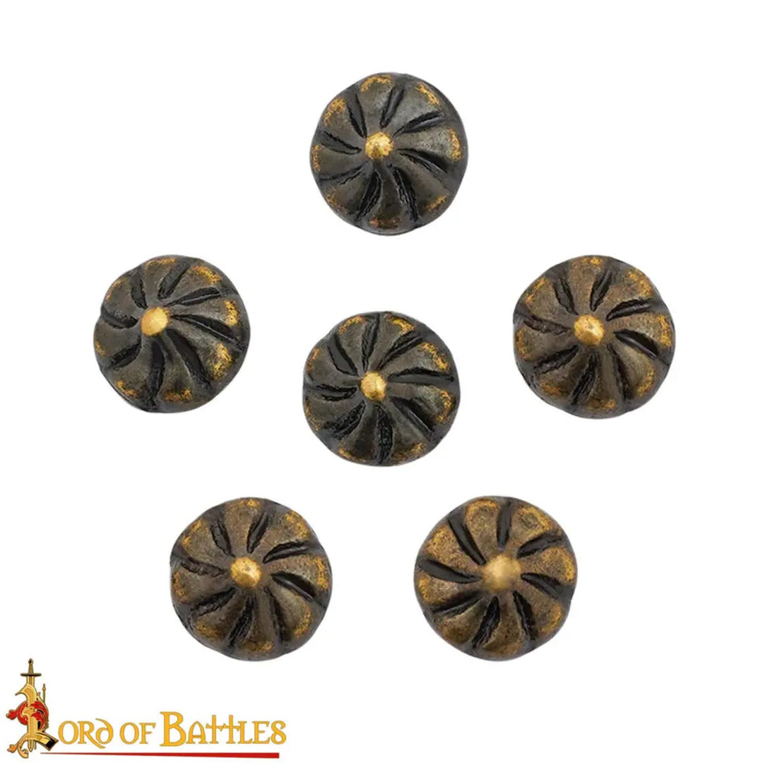 Set of 6 conical brass button studs with floral design for medieval and fantasy costumes. Ideal for LARP, cosplay, and historical reenactment garments.