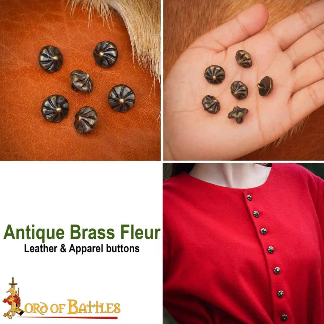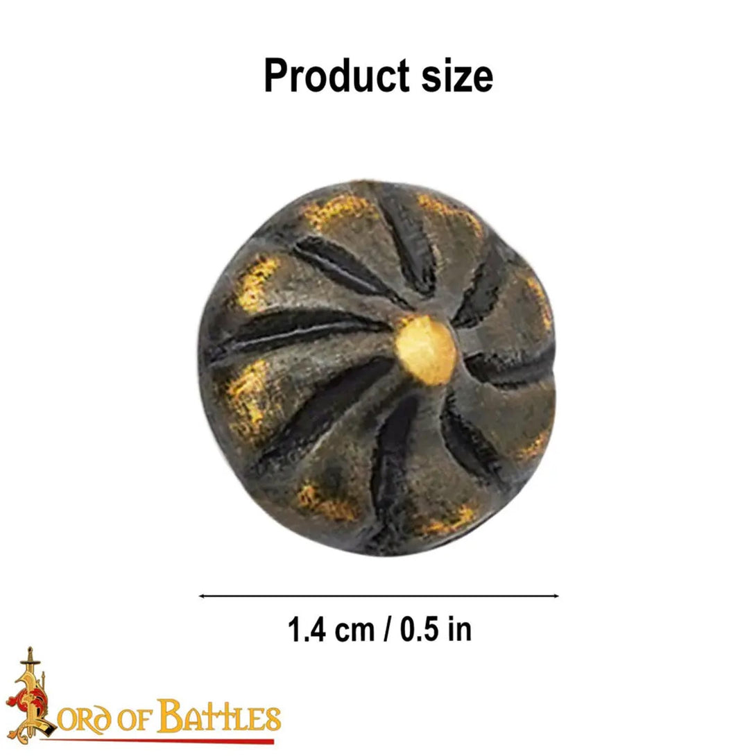 With a compact conical design and refined detailing, these studs are ideal for fastening garments such as houppelandes, pourpoints, or sleeve cuffs. Whether you're preparing for a reenactment, stepping into character for LARP, or building a historically accurate costume, these floral brass studs offer an authentic, understated elegance.