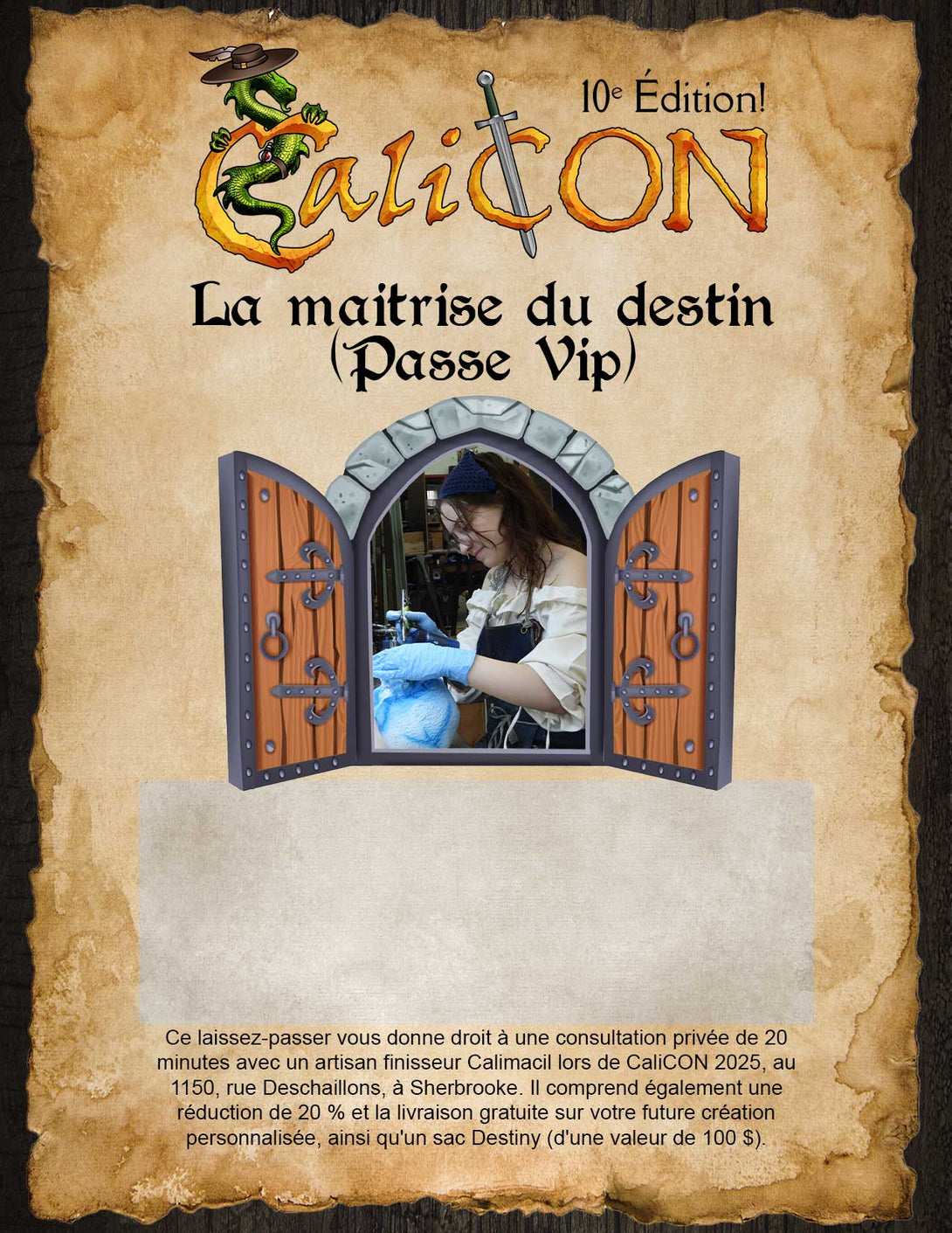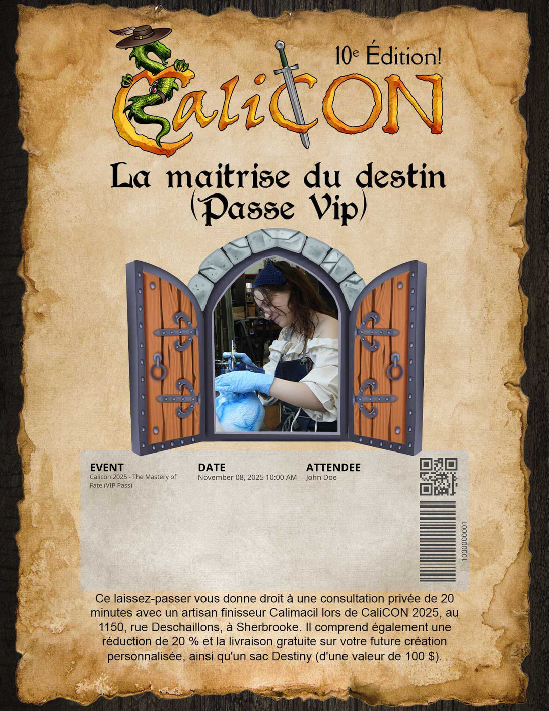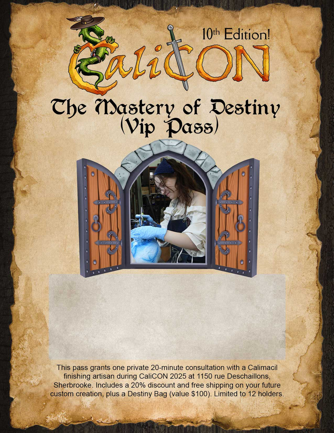 Every hero faces a turning point — a moment to shape their destiny. The Mastery of Destiny is that moment. This exclusive VIP experience at CaliCON 2025 offers you privileged access to the creative heart of Calimacil: a private design consultation with one of our finishing artisans, held directly inside our workshop in Sherbrooke.