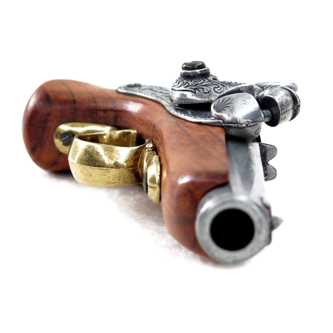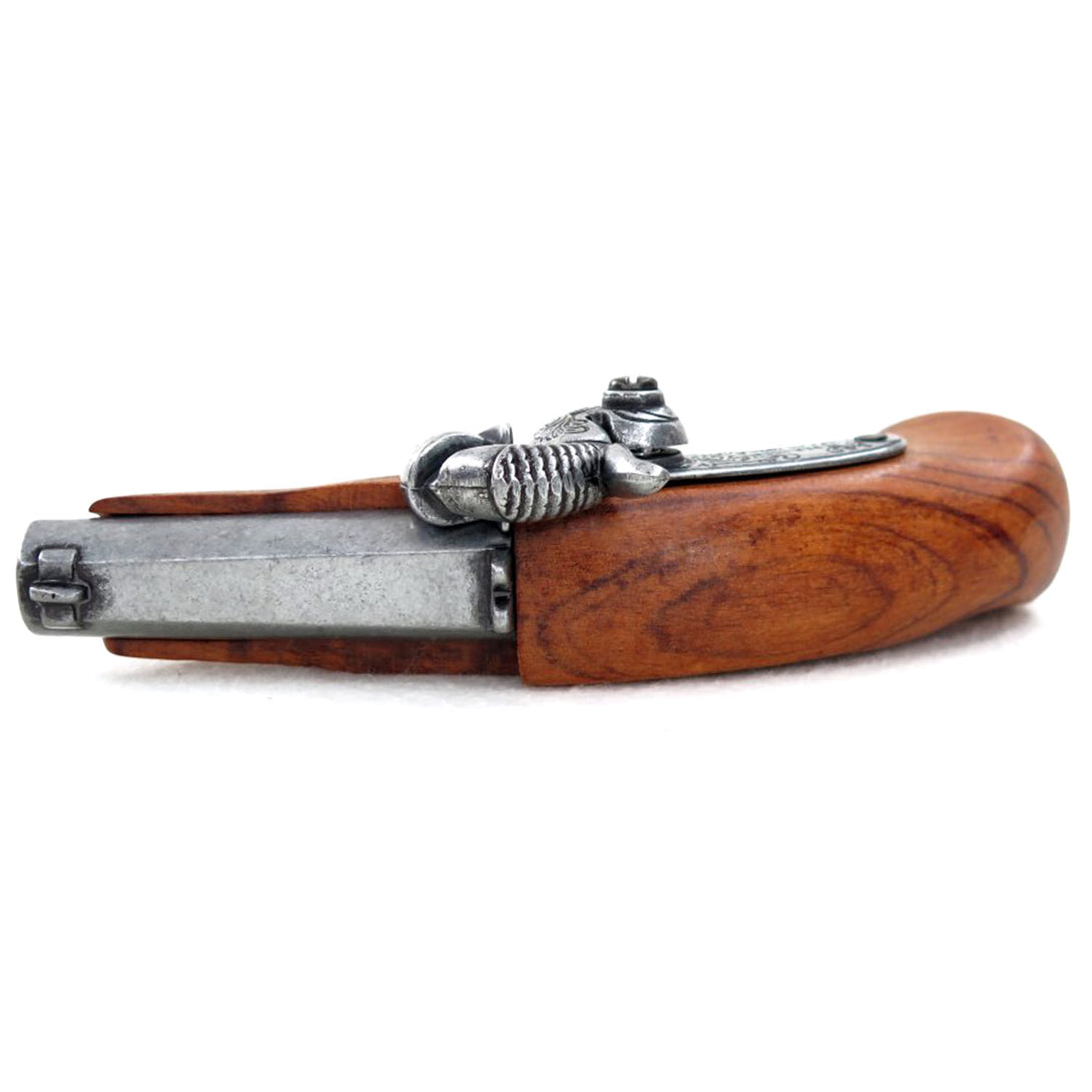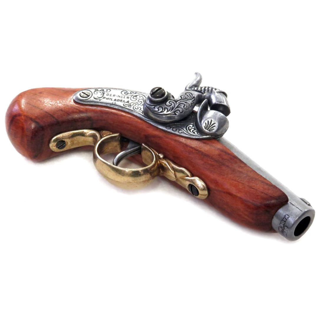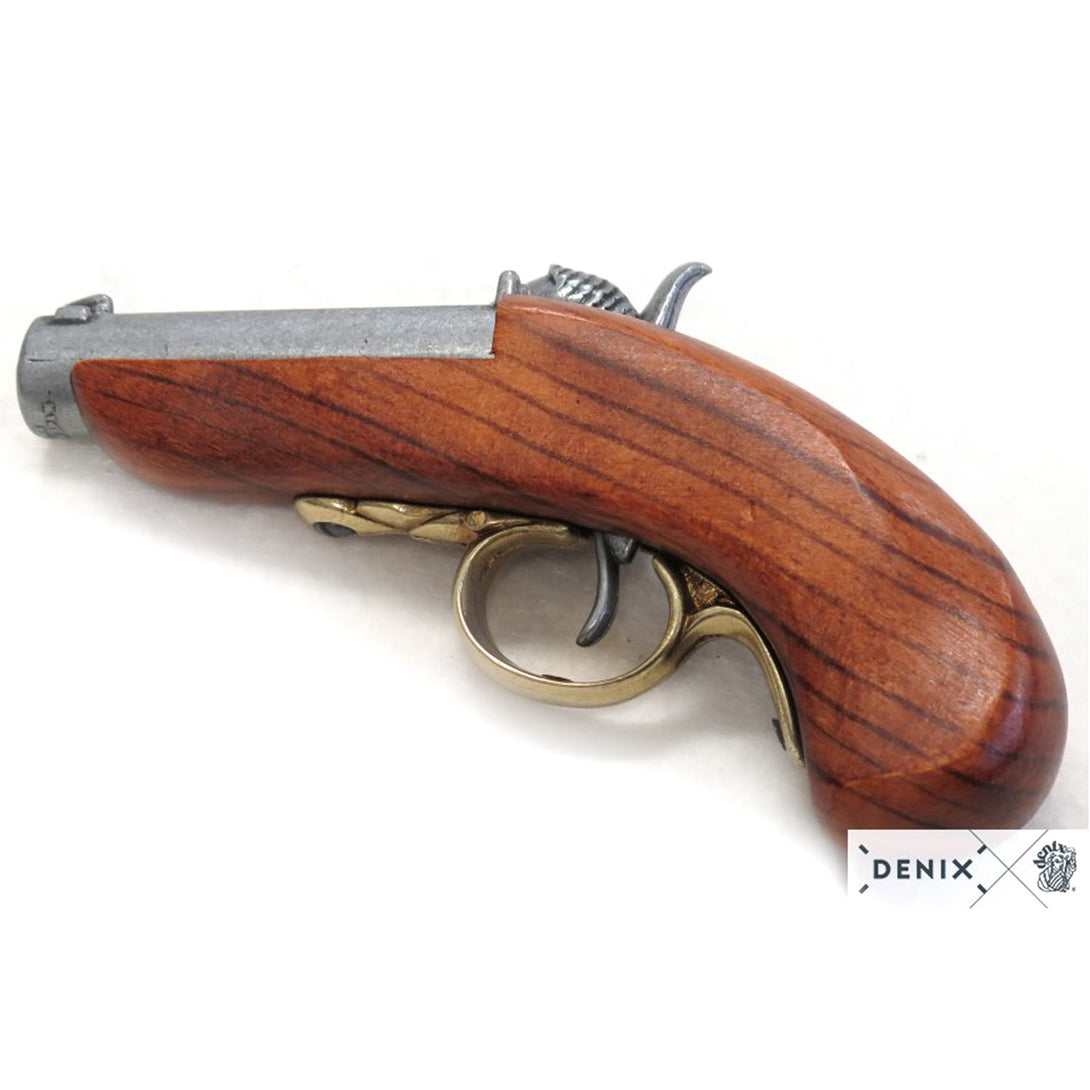This 1850 USA replica Deringer is crafted from real wood and metal, making it an excellent accessory for LARP, historical reenactments, or theatrical play. Designed for mock combat, it can hold caps on the pin to create a loud bang. The barrel is solid and non-functional, ensuring safety.