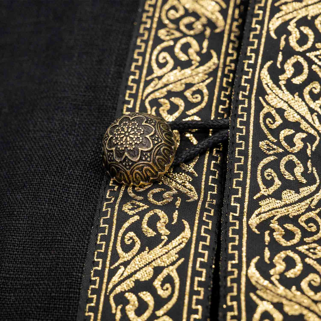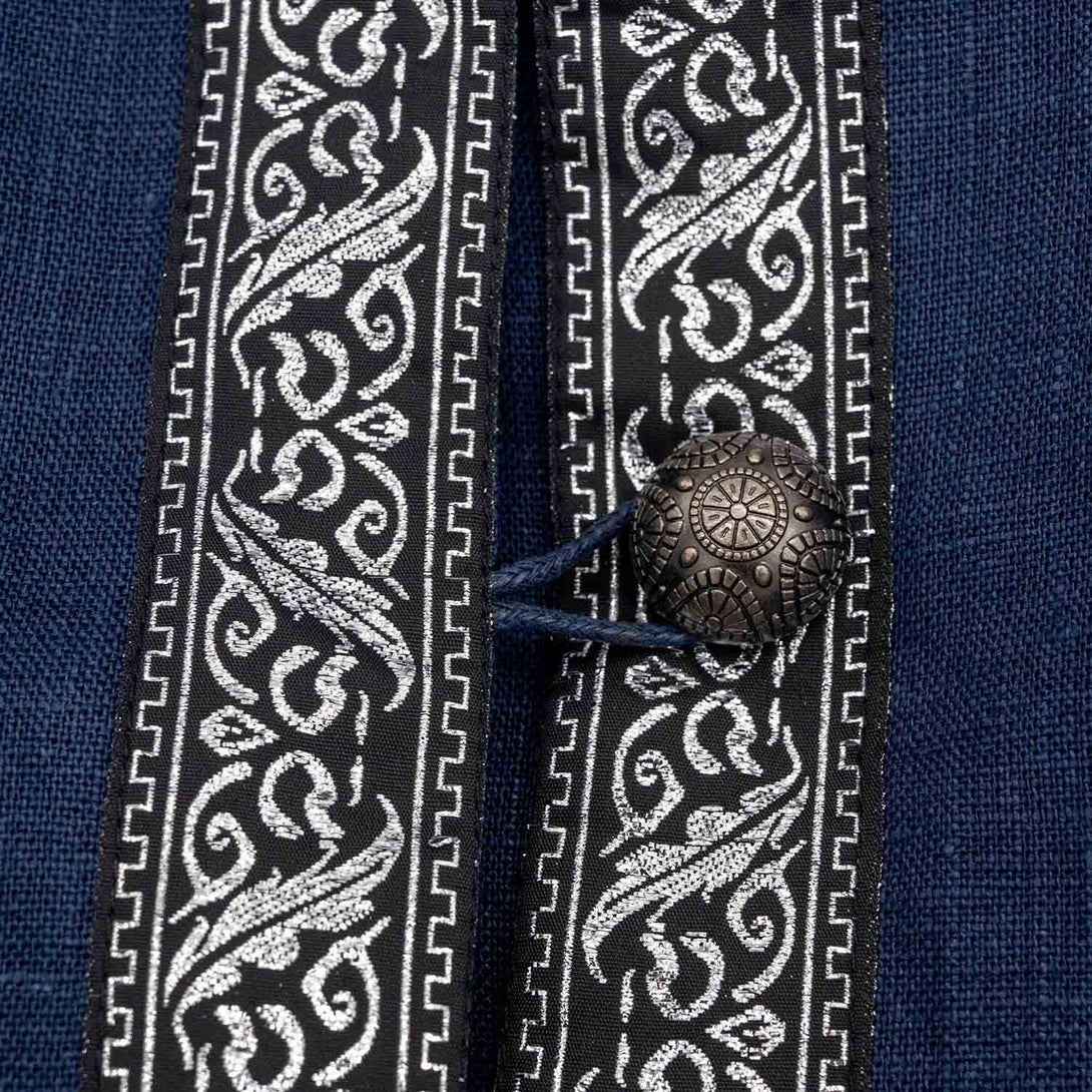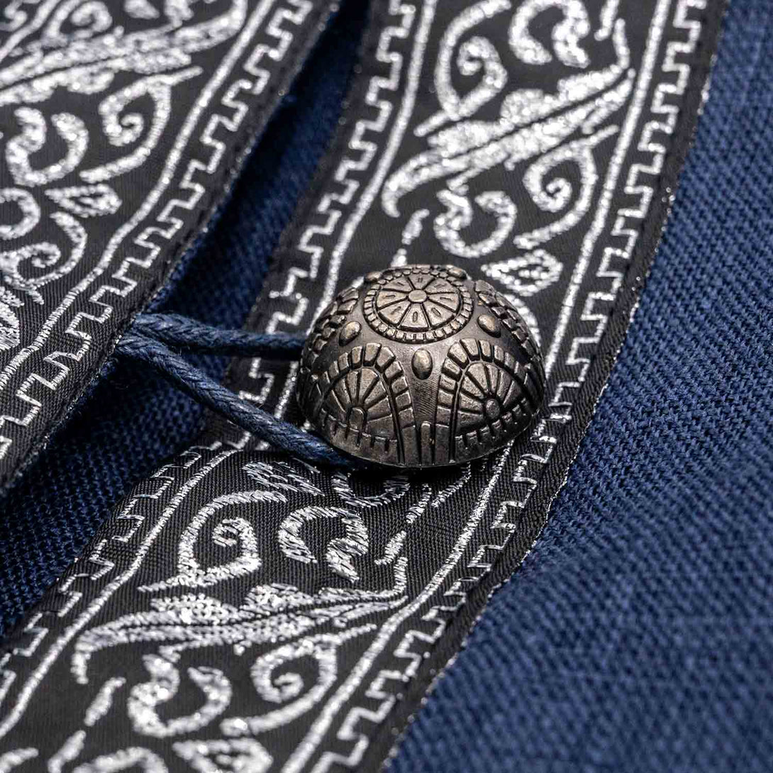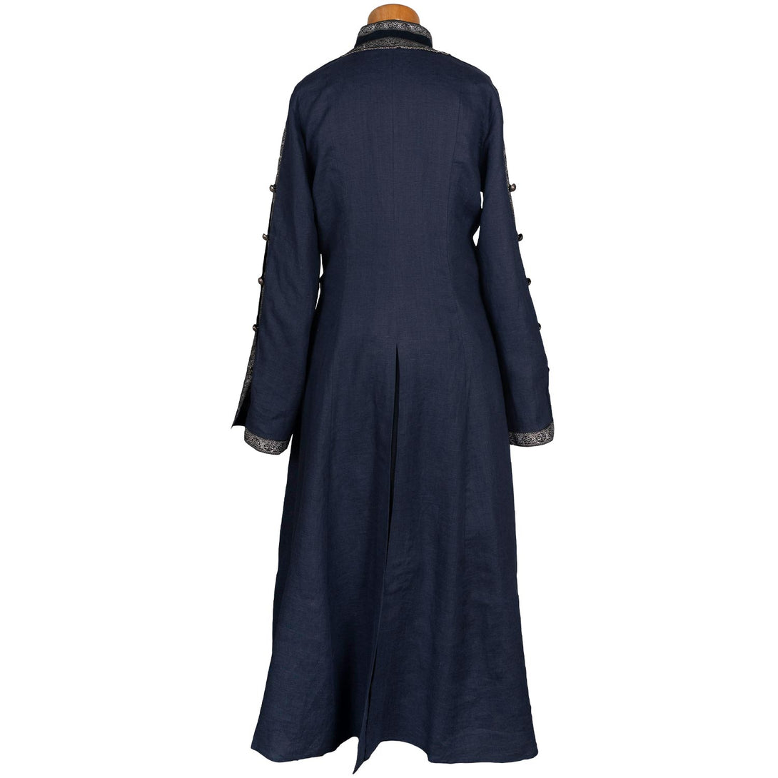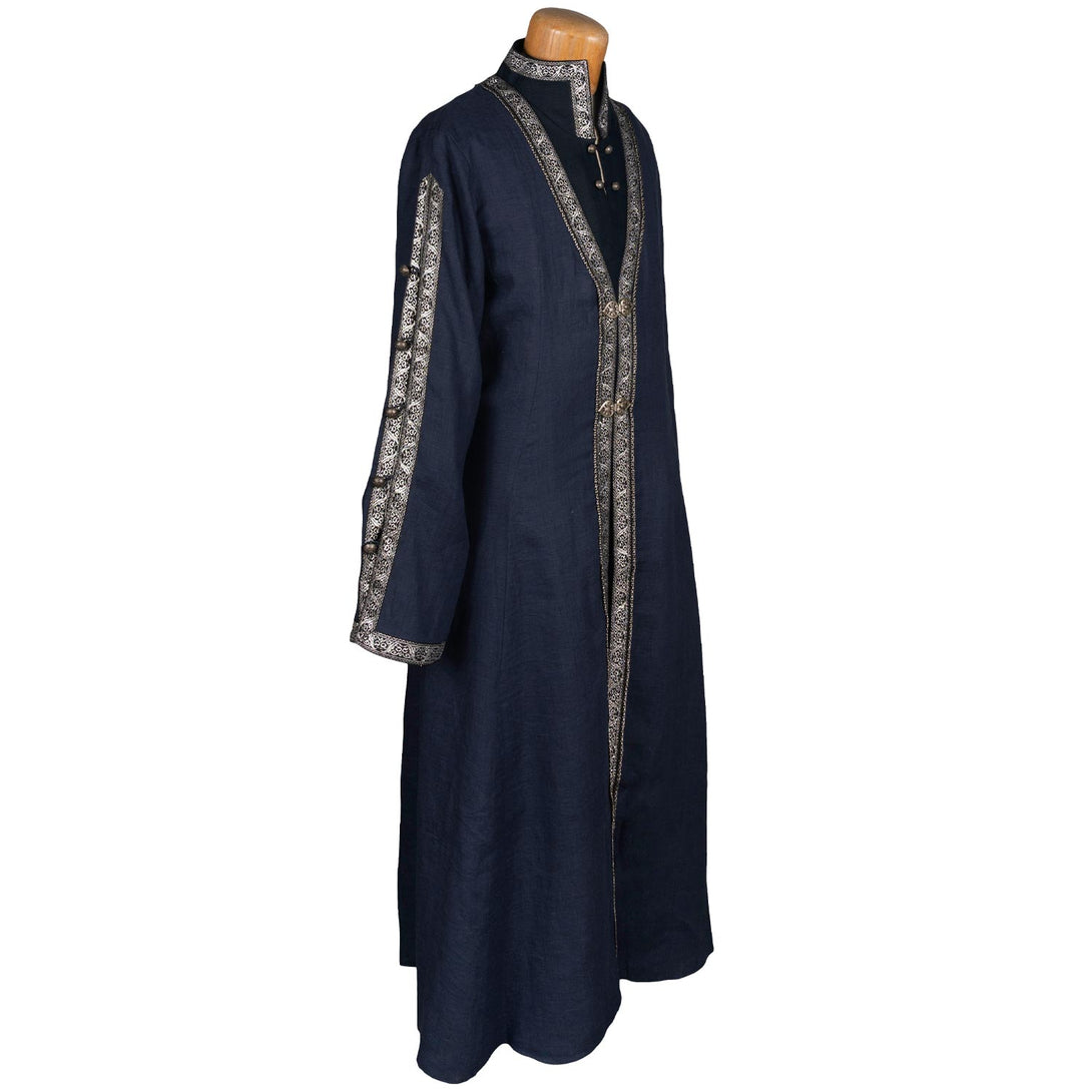 The Eastern Europe Linen Overcoat is a beautifully crafted piece inspired by Eastern European medieval design. Made from 100% natural flax linen, this overcoat offers a sturdy, authentic look and excellent heat protection, making it perfect for both warm and cool weather. The overcoat features silver or golden trim with a medieval-style pattern, adding to its historical accuracy and elegance. With long sleeves and buttons to open or close them and an ankle-length cut, this overcoat can be worn with or without a belt, making it a versatile addition to your LARP or historical costume. It’s especially suitable for Polish, Rus, or Slovakian characters, but can also enhance any medieval or fantasy look.