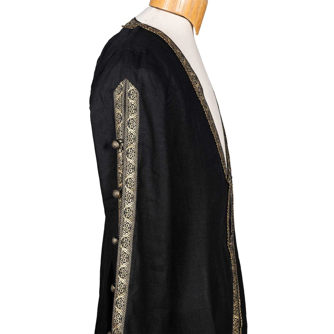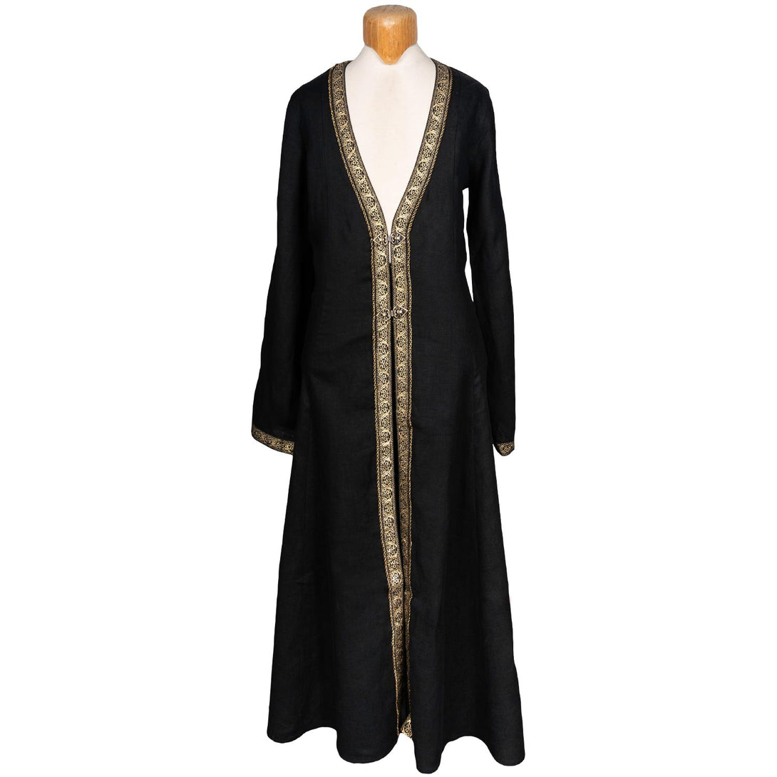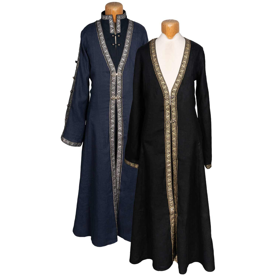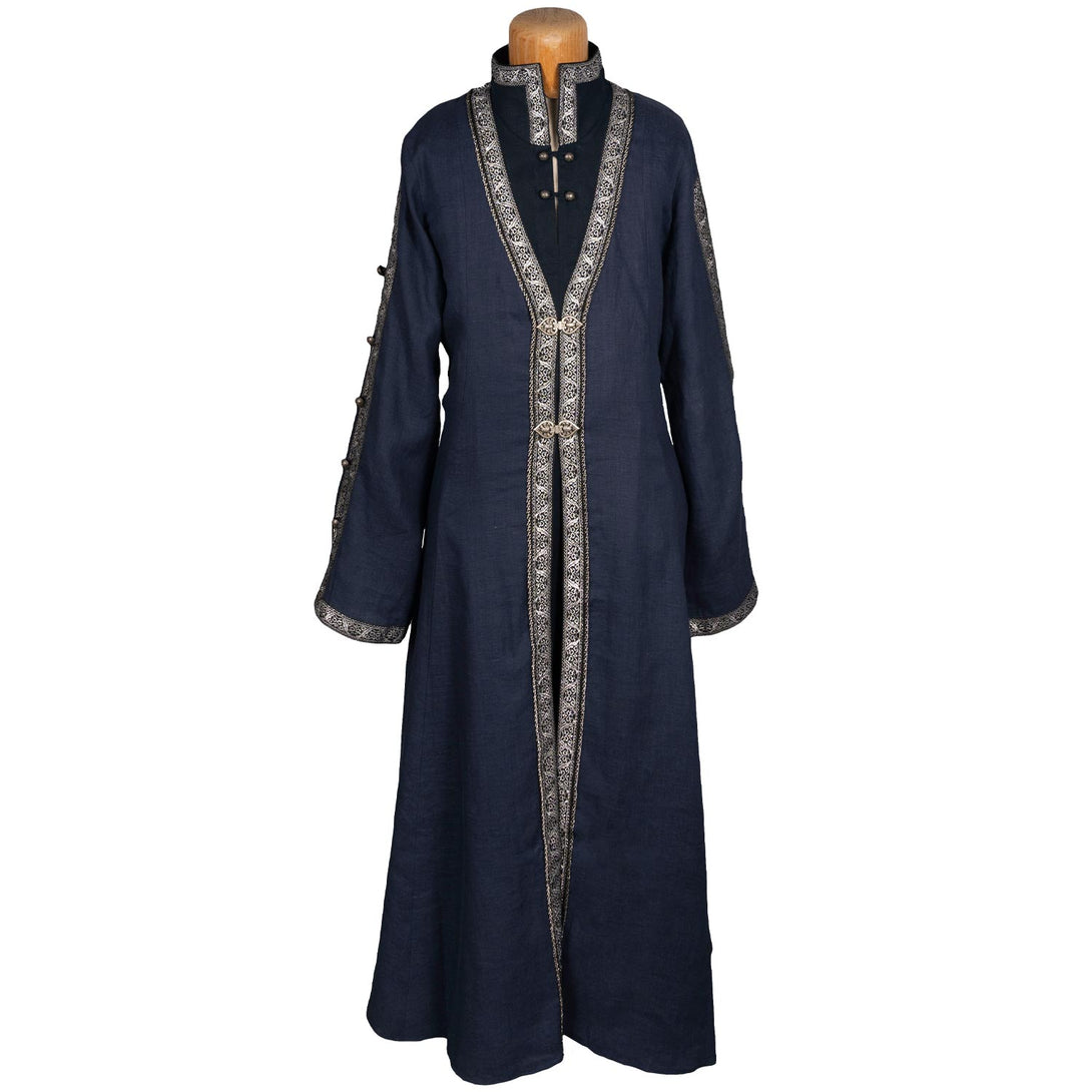 The Eastern Europe Linen Overcoat is a medieval-inspired garment made from 100% natural flax linen. Featuring silver or golden trim, decorative clasps, and long open sleeves, this ankle-length overcoat offers both authenticity and versatility. Ideal for Eastern European, medieval, and fantasy LARP characters, it can be worn with or without a belt for a regal look. Perfect for noble warriors, traveling adventurers, and knights.