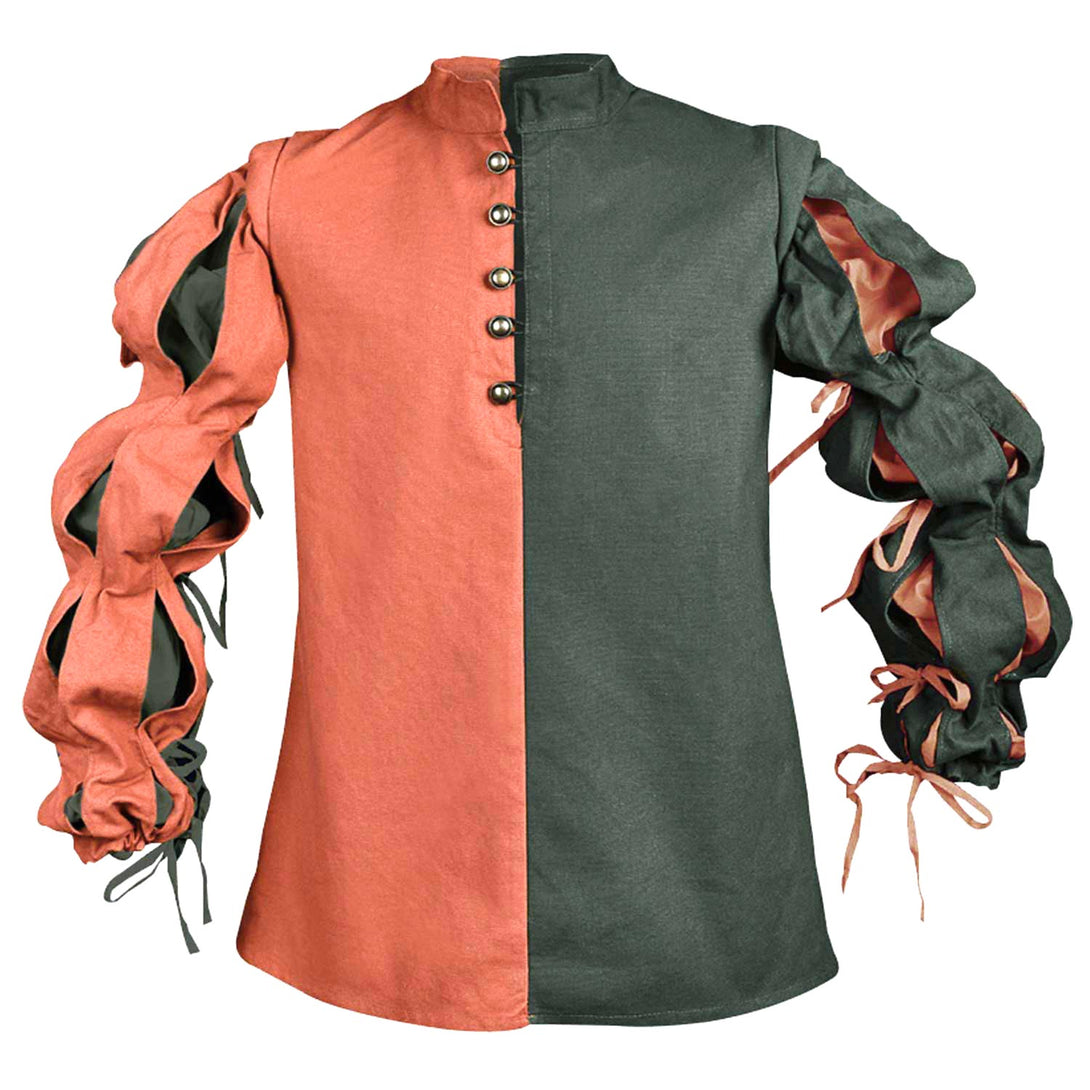 The "Jörg" doublet is a bicoloured, slit jacket made along historical patterns of the legendary lansquenet mercenaries. It is not certain, where this fashion originated from, but historians suggest, that lansquenets started cutting their clothing, for it was too tight for them to fight in them. This is, how this fashion came along with the famous mercenaries. The doublet is elaboratly cut and made from robust, high quality canvas material. It allows a very free movement when fighting. The five antique finished brass buttons in the front allow the doublet to be closed on cooler days. The lacing along the sleeves leads to the typical buffy look of the lansquenet fashion.
