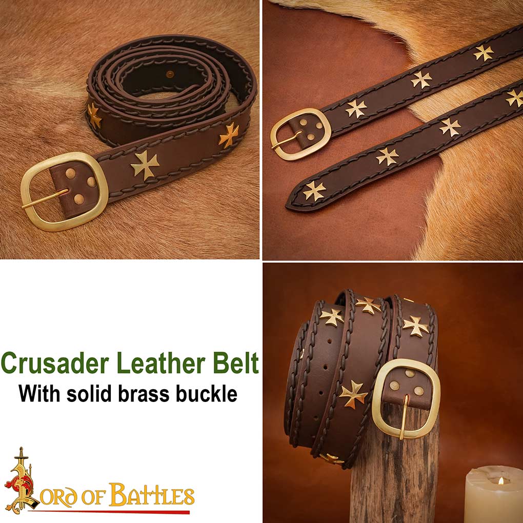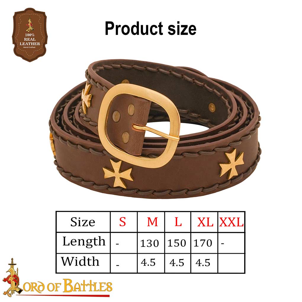 Genuine leather Crusader belt with brass cross decorations. Ideal for LARP, cosplay, and Renaissance festivals. Available in 130, 150, and 170 cm sizes.