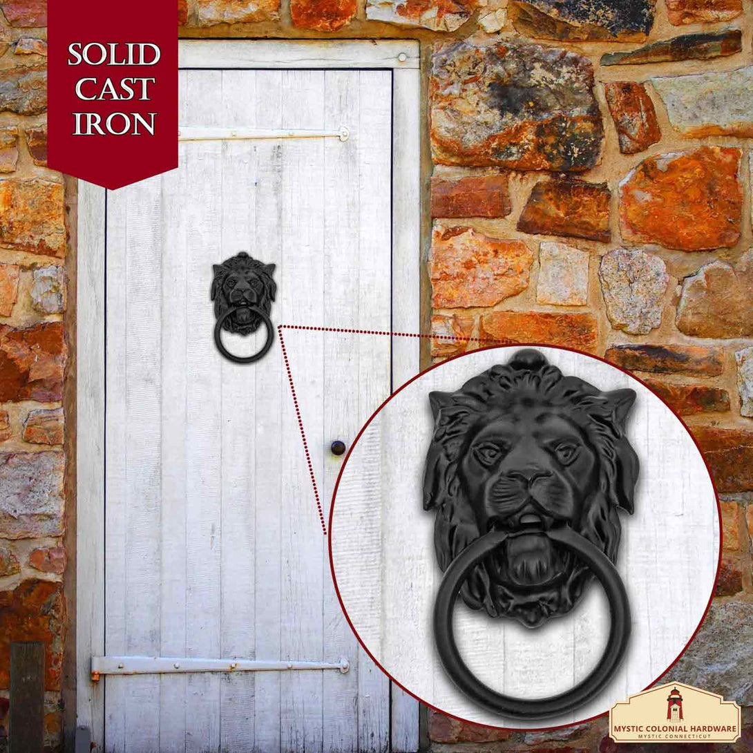 Hand-forged iron lion door knocker with weatherproof finish. Bold medieval design perfect for gothic, fantasy, or Victorian-style homes.