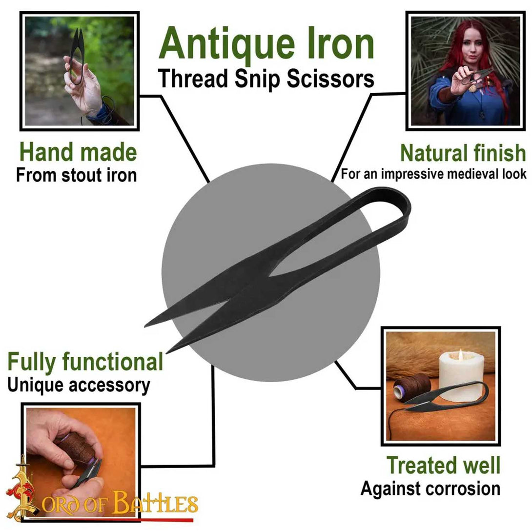 Hand-forged medieval iron thread snips for sewing, crafting, and LARP. Lightweight and historically inspired scissors perfect for reenactment and cosplay gear.